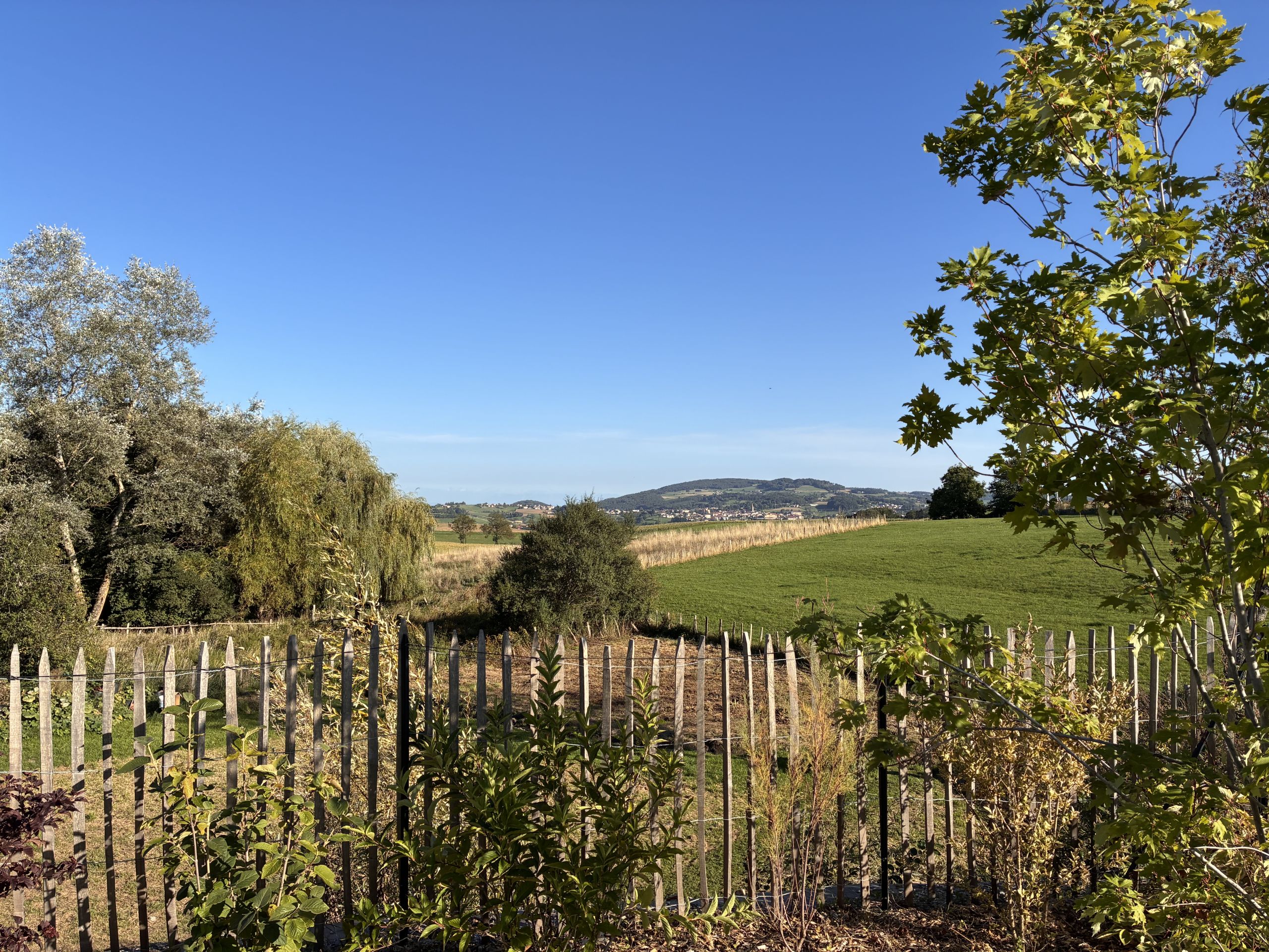 Petit salon de la colocation avec vue sur les collines des Monts.