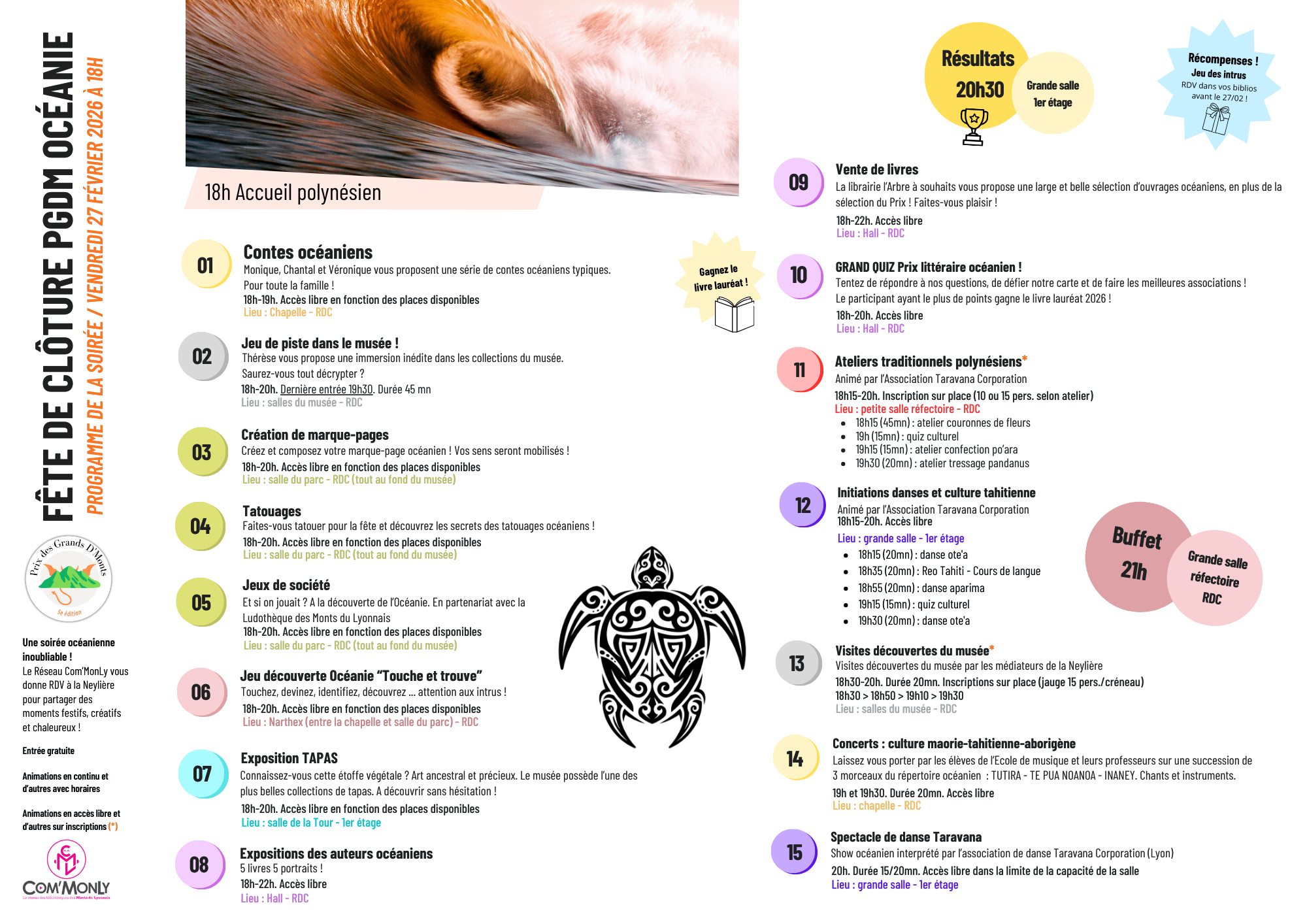 Participez à différentes activités proposées autour de la culture océanienne : ateliers traditionnels polynésiens* – initiations danses – concerts – contes – ateliers créatifs – jeu de piste dans les collections – visites découvertes du musée* – spectacle de danse – etc.